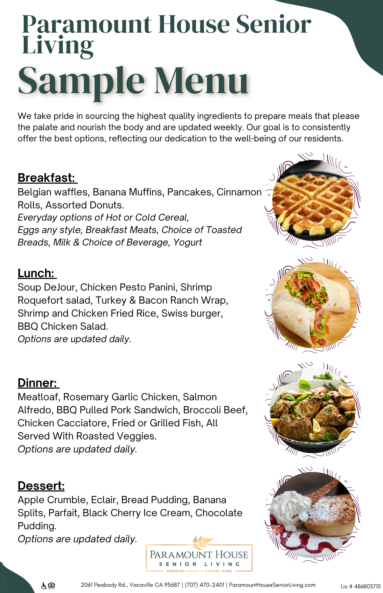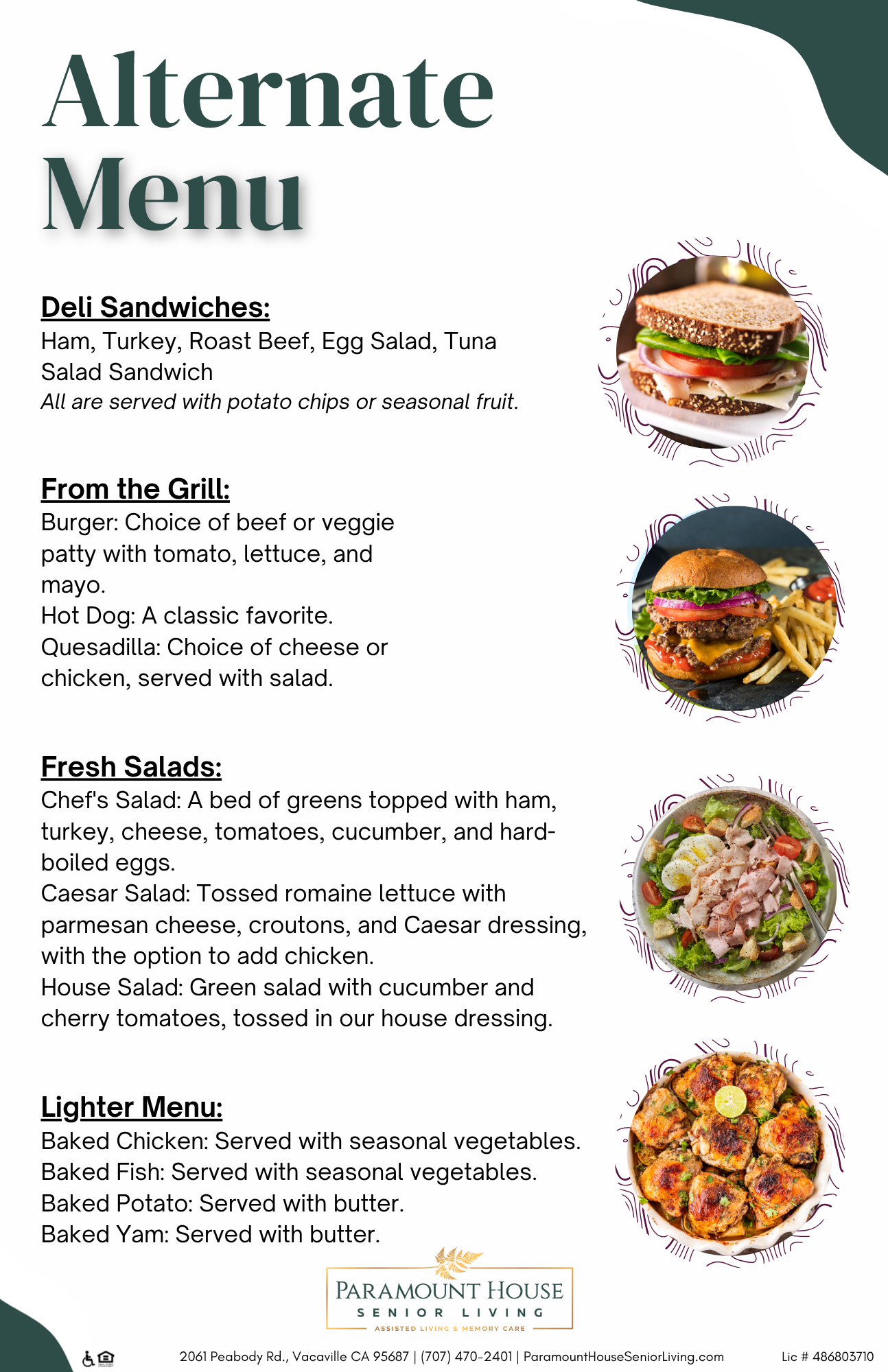 We take pride in offering a dining program that caters to every resident’s preferences and dietary requirements. Our menus are diverse, featuring everything from comforting classics to exciting international flavors, all prepared with the finest ingredients. Whether you’re craving a hearty stew, a fresh salad, or a delicate dessert, our chef ensures that every meal is balanced and satisfying.